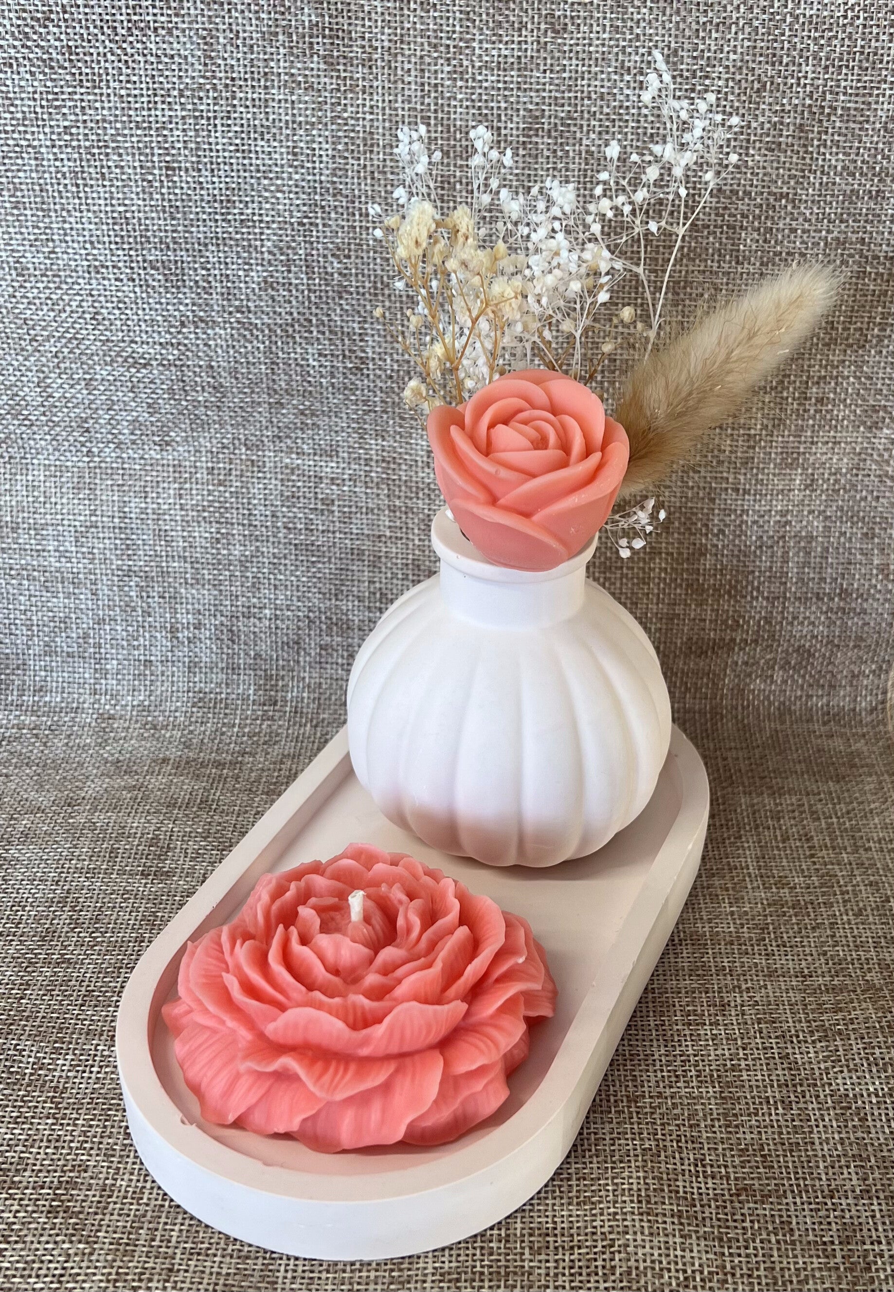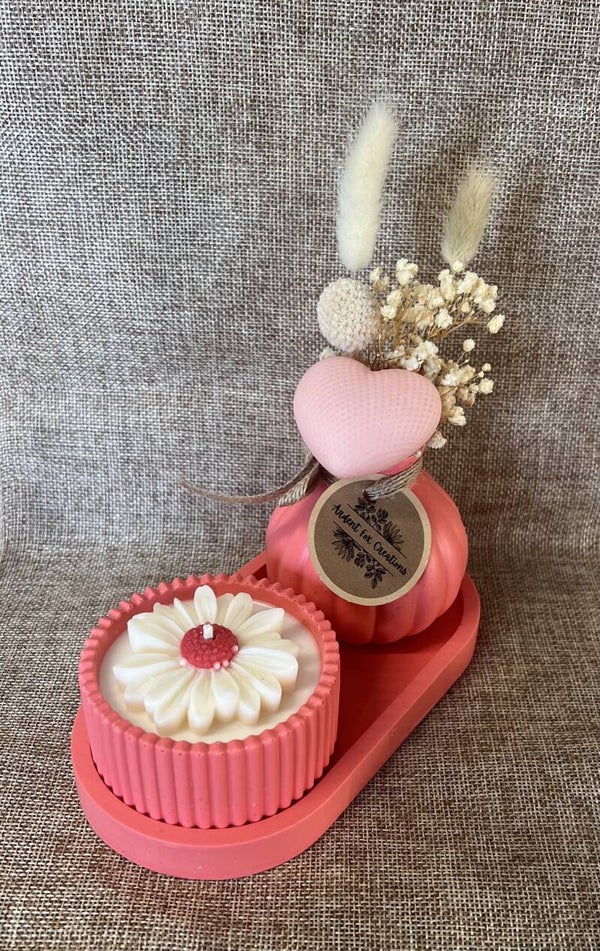 A cut and useful tray with a vase with a melt or two and a candle with variations. Maybe add a ring holder.